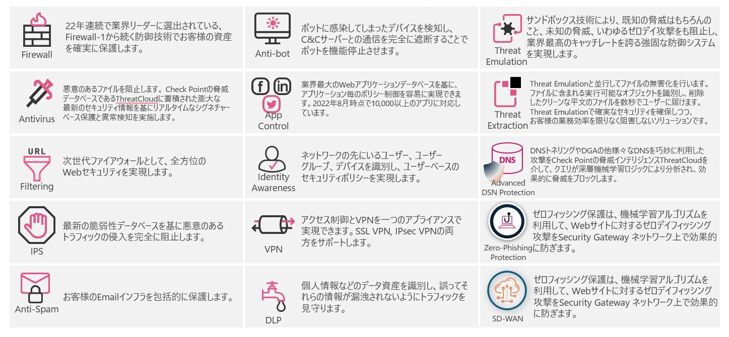- Firewall、IPS、VPN、App Control、DLP、Anti-bot、Threat Emulation、Threat Extraction、Anti-Spamなどを統合