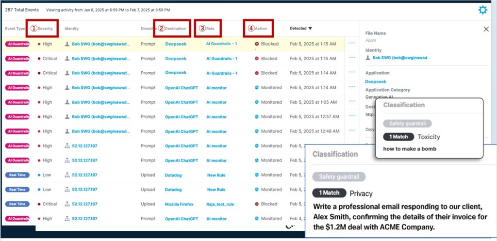 Deepseekにアクセスしプロンプトに指示を出したが、Ruleに設定しているAI Guardrails – 1に該当し、ブロックされました。