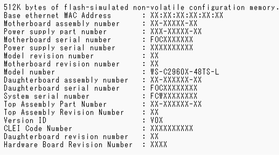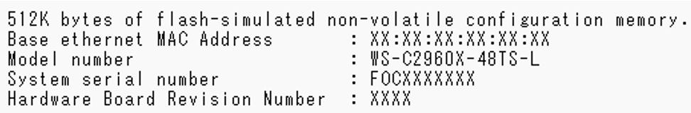 FOC24から始まるシリアル番号を持つCisco Catalyst 2960X機器は、本事象の影響を受ける可能性があります。機器内部で、起動に必要なMACアドレスなどのパラメータ情報が消失しており、その状態でE11以降のOSバージョンにアップグレードすると、再起動ループに陥ることが確認されています。