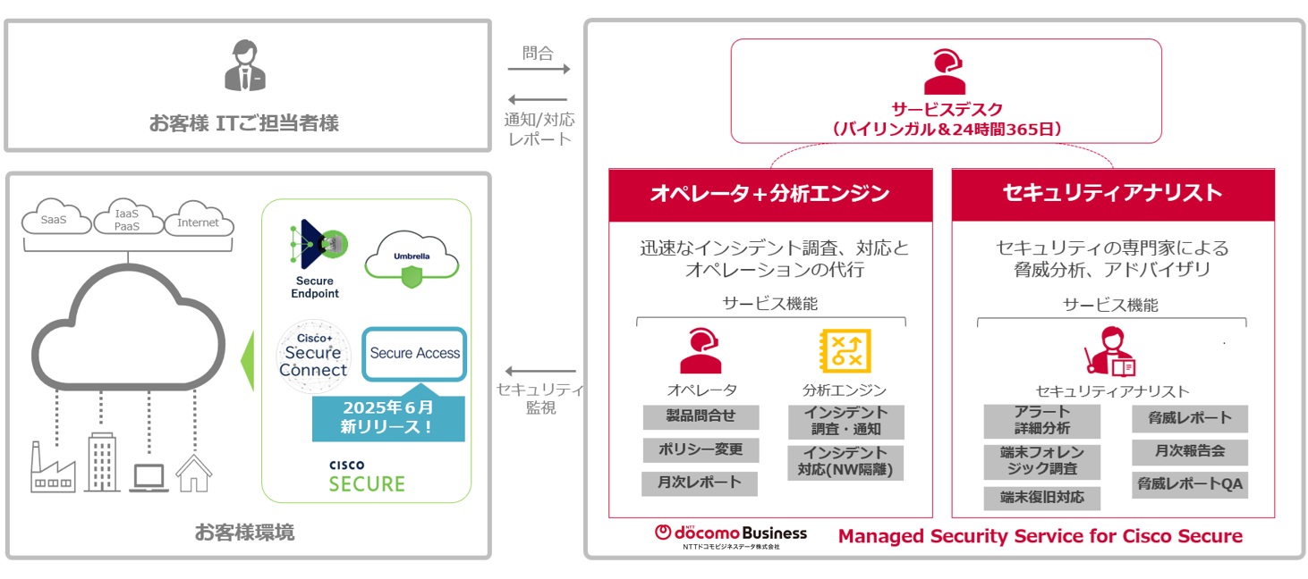 NTTドコモビジネスデータはCisco製品の知見・導入実績を活かし、お客様のビジネスを守る最適なソリューションの提供からハイレベルなSOC運用まで一貫して提供しています。セキュリティに関するご相談はNTTドコモビジネスデータまでお気軽にお問い合わせください。