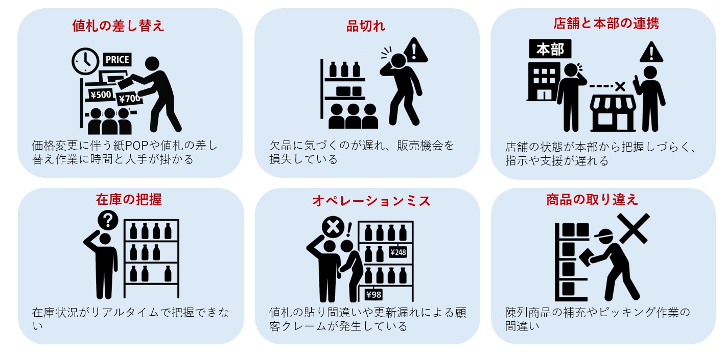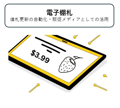 価格設定の自動化と一元管理 手動作業を排除し、人的ミスを防止 | リアルタイム棚監視 欠品や誤配置を検知、データとして可視化 | ダイナミックな店頭キャンペーン コンテンツを配信、購買意欲を刺激 |