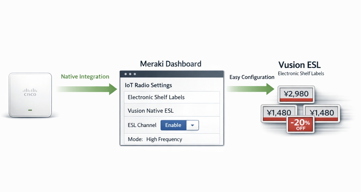 Cisco Merakiなら、Vusion 電子棚札の設定も楽々。 | Cisco MerakiのAPは電子棚札専用のAPとしてだけでなく、店舗内の |